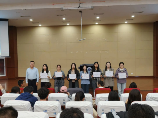 大会现场为各星级文明宿舍颁发荣誉证书。张瑞岗为玉泉校区西院五号楼楼长张丽娟颁奖,并感谢她对数学科学学院学子的照顾。