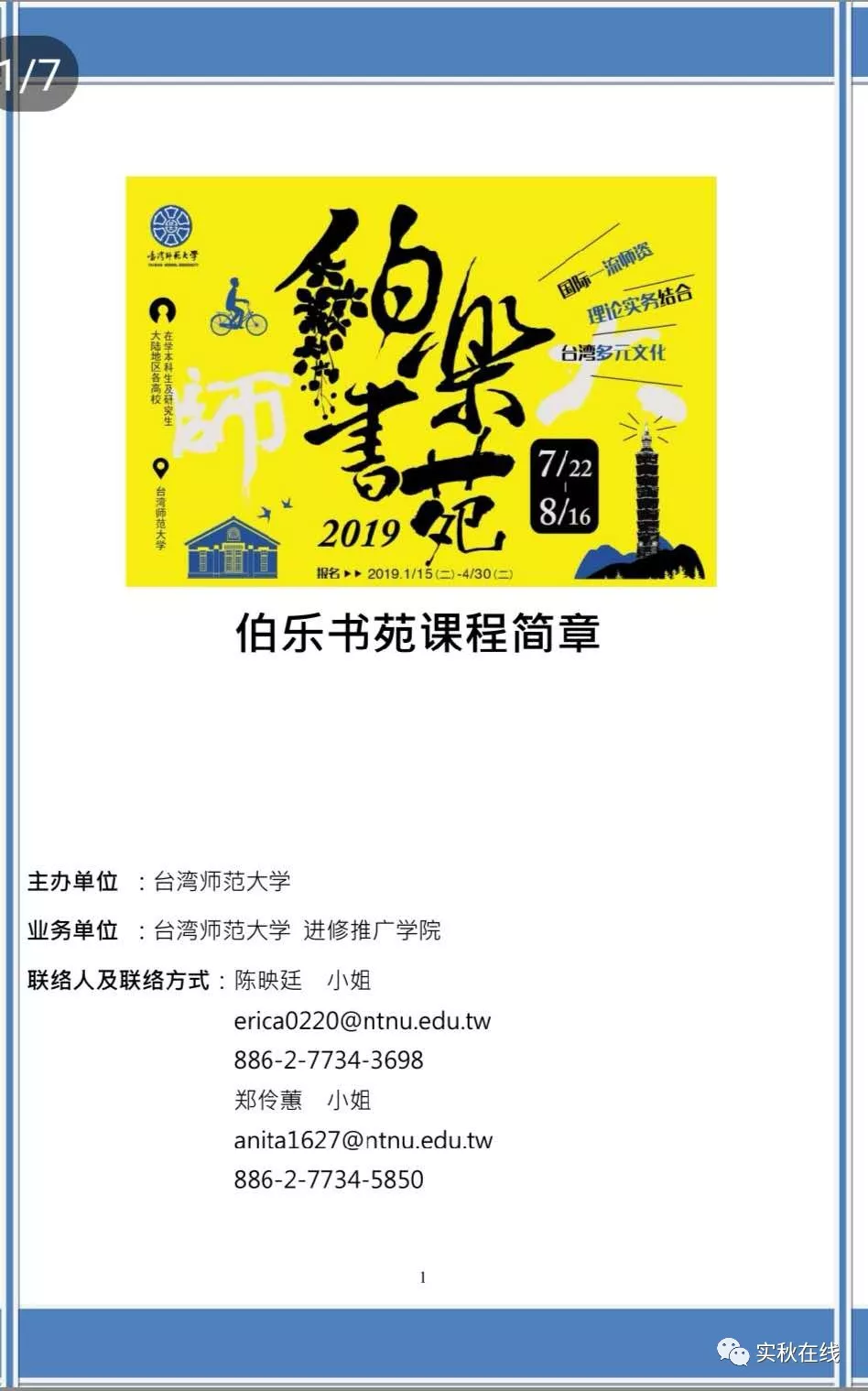 为加强海内外高等教育的交流与合作,增进学子间的沟通与了解。台湾师范大学开办暑期夏日课程已数个年头,今(2019)年暑期开办全新伯乐书苑。希冀由本校「广博雅致,师大大师」之通识教育精神,期许每位到台师大进修的学子,都能在求学生涯中遇见伯乐,并得到充实又丰盛的学习成果。本研习课程分为三门师大品牌课程,提供优秀青年学子利用暑假来本校研习课程。同时透过来台研修期间,除获得专业知识外,更能深入了解台湾的风土民情。
